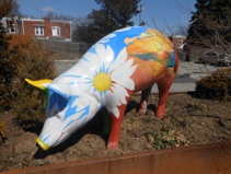 I was sponsored by Recycle Bank to paint a lifesize pig sculpture in 2006, my pig “Daisy” was auctioned off to benefit the Chestnut Hill Community Fund, the Preservation and Beautification of the Chestnut Hill District and the Philadelphia Zoo. A local lawyer, Marilyn Monaco purchased Daisy and gave her to the Chestnut Hill Hotel to display at the nearby Farmer’s Market . After a recent renovation project, Daisy appeared on the roof. Now I know that pigs really can fly with the help of art sponsors!